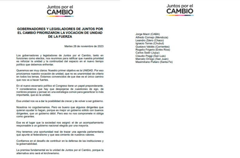En medio de las versiones que apuntan a que un sector mayoritario del PRO abandonaría JxC para sumarse a una nueva coalición junto a los libertarios, los mandatarios le pidieron a los bloques del Congreso nacional mantenerse unidos para evitar ese desenlace. Según trascendió, existe una alta probabilidad de una ruptura del PRO con Cristian Ritondo (posible presidente de la Cámara baja) llevándose cerca de 40 diputados nacionales a la alianza con La Libertad Avanza (LLA).
