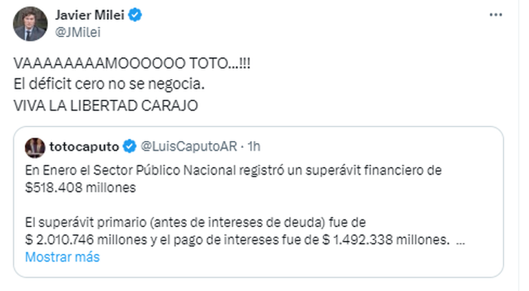 "Vaaaaaaaamoooooo Toto...!!!", escribió el jefe de Estado en su cuenta de X en alusión el ministro y finalizó su posteo con su clásico "viva la libertad carajo" y replicó una publicación de Caputo en la misma red social.