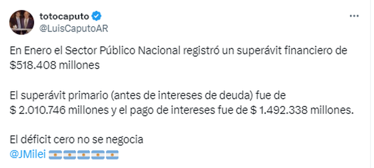 El anuncio del superávit que se venía anticipando en los últimos días fue presentado por el ministro de Economía, Luis Caputo, en su cuenta de X, en la que dijo que "en enero el Sector Público Nacional registró un superávit financiero de $518.408 millones".