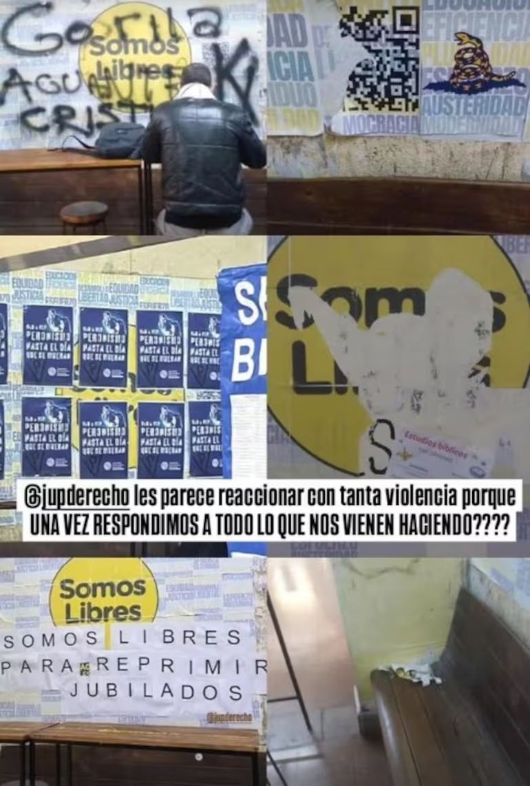 De la misma manera en que trascendió la pintada de los libertarios a mesas de la JUP, revelaron desde "Somos Libres" algunas imágenes de los carteles que pegaron desde el peronismo arriba del espacio que tenían designado los libertarios. "Gorila aguante Cristina (Kirchner)", está escrito en grafiti en una pared. "Somos Libres (una chicana a la agrupación) para reprimir jubilados", dice otro cartel.