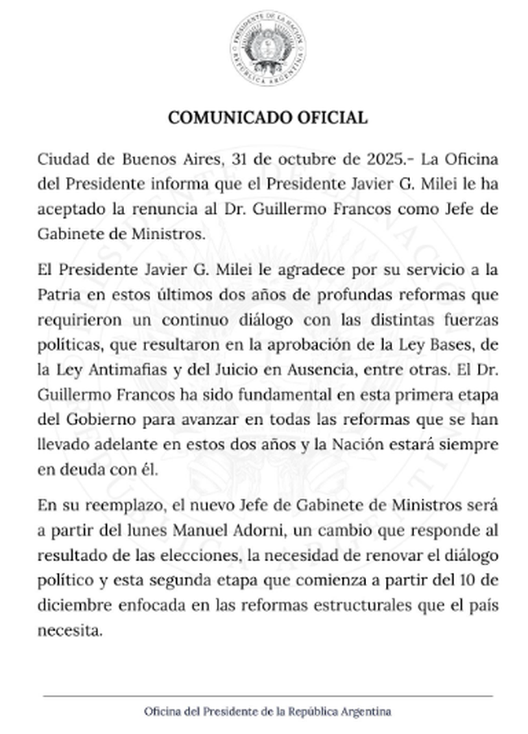 Desde la Oficina del Presidente, confirmaron que se aceptó la dimisión a la jefatura de Gabinete de Francos. En un apartado se destacó: "El Presidente Javier G. Milei le agradece por su servicio a la Patria en estos últimos dos años de profundas reformas que requirieron un continuo diálogo con las distintas fuerzas políticas, que resultaron en la aprobación de la Ley Bases, de la Ley Antimafias y del Juicio en Ausencia, entre otras. El Dr. Guillermo Francos ha sido fundamental en esta primera etapa del Gobierno para avanzar en todas las reformas que se han llevado adelante en estos dos años y la Nación estará siempre en deuda con él.