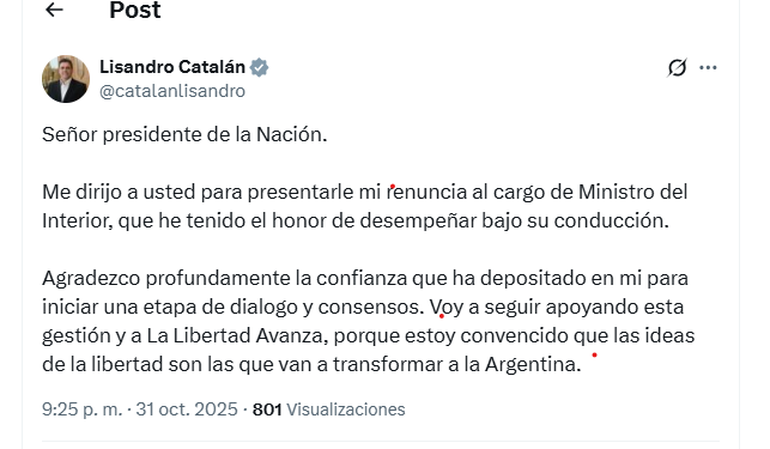 Otro ministro que presentó su renuncia fue el de la cartera del Interior, Lisandro Catalán. "Señor presidente de la Nación. Me dirijo a usted para presentarle mi renuncia al cargo de Ministro del Interior, que he tenido el honor de desempeñar bajo su conducción", comenzó Catalán a través de su cuenta oficial de X.