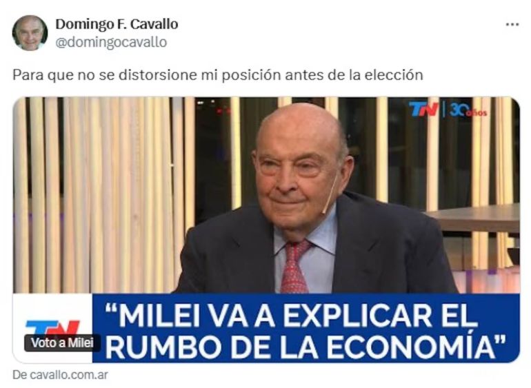 “Para que no se distorsione mi posición antes de la elección”, escribió el ministro de Economía de Carlos Menem en un posteo en su cuenta de X. Y compartió una entrevista de 2023 con Diego Sheinkman en TN en la que anticipaba su voto a favor de Milei y delineaba los puntos claves de lo que debía hacer Milei para estabilizar la economía.