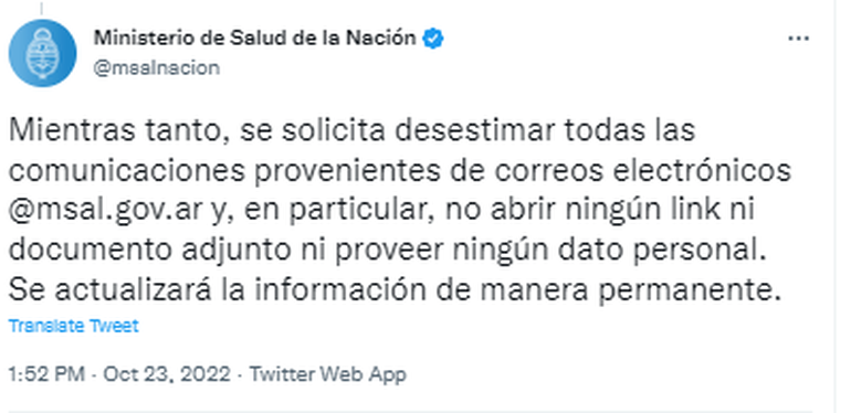 Y pidieron a los usuarios: “Mientras tanto, se solicita desestimar todas las comunicaciones provenientes de correos electrónicos @msal.gov.ar y, en particular, no abrir ningún link ni documento adjunto ni proveer ningún dato personal. Se actualizará la información de manera permanente”.