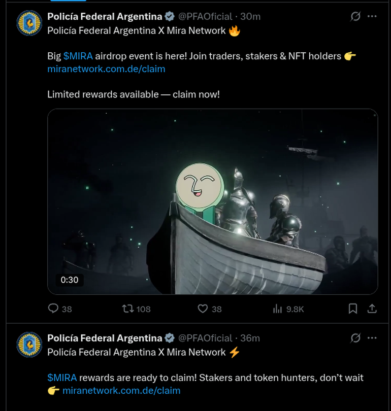 Durante la media mañana de este viernes se viralizó una publicación de la cuenta de X de la Policía Federal Argentina. La publicación invitaba a traders a invertir en una criptomoneda de nombre $MIRA.