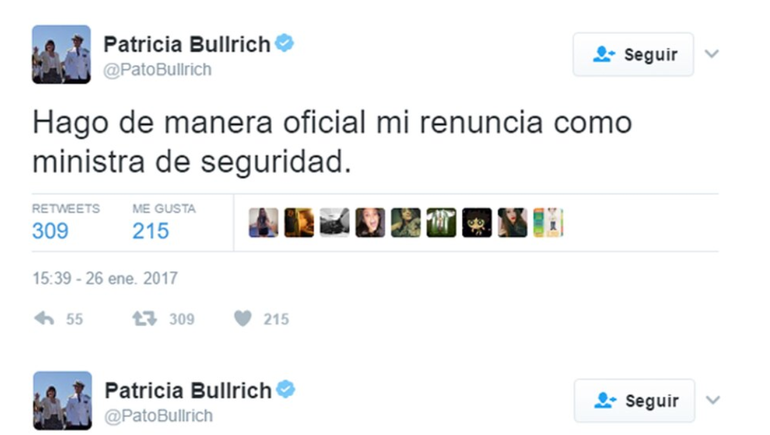 "Hago de manera oficial mi renuncia como ministra de seguridad", comienza la catarata de posteos, que finalizan con una adjudicación: "Cuenta en manos de [S], ema, saludos a turrosec y @notavago".