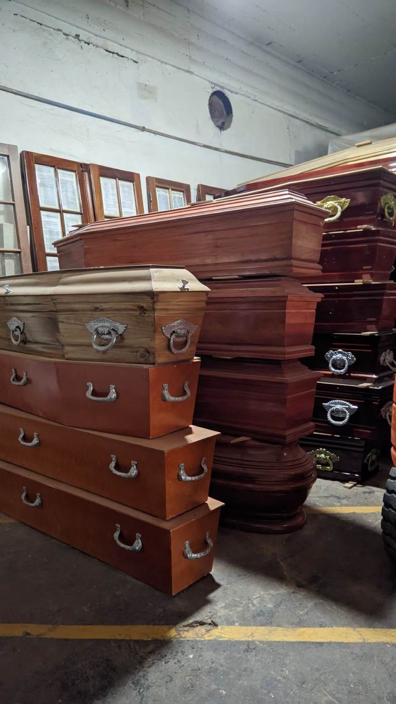 Las imágenes no solo mostraban el particular dispositivo metálico con forma de cajón, adaptado para funcionar como parrilla, sino también parte del taller donde se desarrollaba la actividad cotidiana de la empresa. En el fondo podían verse numerosos ataúdes apilados, listos para su comercialización, lo que reforzaba el contraste entre el clima festivo del asado y el escenario poco habitual para una reunión gastronómica.