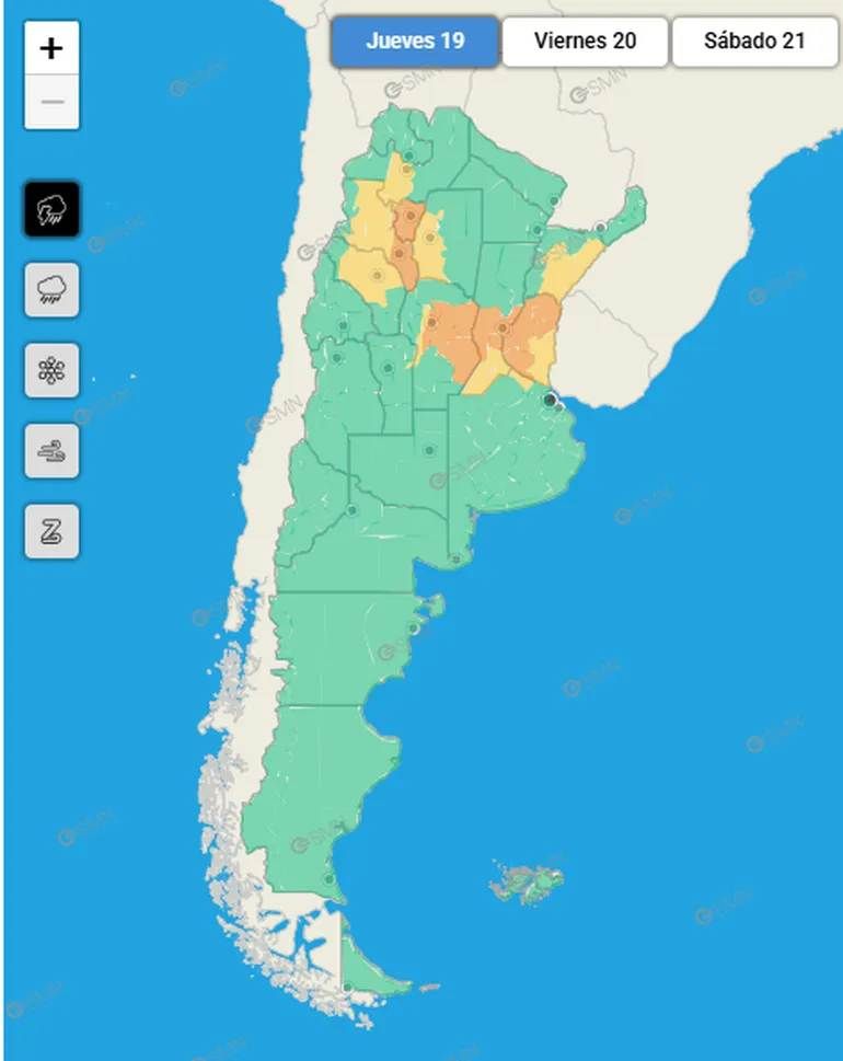 El aviso rige para este jueves y abarca gran parte del centro y norte argentino, donde se esperan tormentas de variada intensidad, algunas localmente fuertes o severas. En este contexto, el SMN estableció alerta amarilla para varias zonas y elevó el nivel a alerta naranja en sectores donde se prevé un mayor impacto del fenómeno.