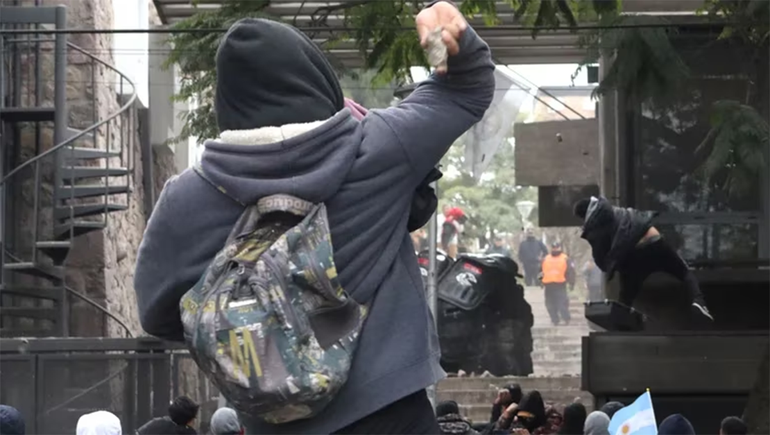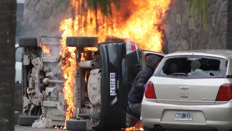 Ante el conocimiento de lo declarado por el mandatario provincial, los manifestantes decidieron ingresar por la fuerza a la Legislatura y hasta prendieron fuego algunos sectores y autos que estaban estacionados en las cercanías del lugar y que, previamente, usaron como escudos.