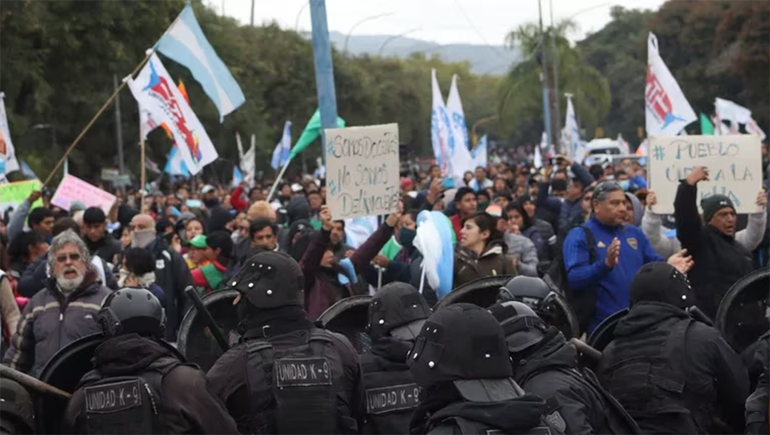 Por su parte, efectivos de infantería de la policía jujeña se enfrentaron con los manifestantes, arrojando balas de goma y gases lacrimógenos.