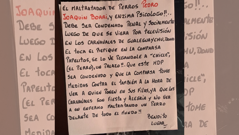 Diferentes asociaciones proteccionistas de Gualeguaychú difundieron el recorte del video del canal en YouTube del Carnaval del País donde se observa claramente que un integrante de la batucada "Los Pibes", la cual dirige Esteban Martín Piaggio e integra la propuesta "Iguales" de la comparsa Papelitos, golpea en la cabeza a un perro callejero con un palillo. El animal comenzó a ladrar mientras la batucada realizaba su show y en ese momento un batuquero golpeó al animal, que escapó de la pista asustado.