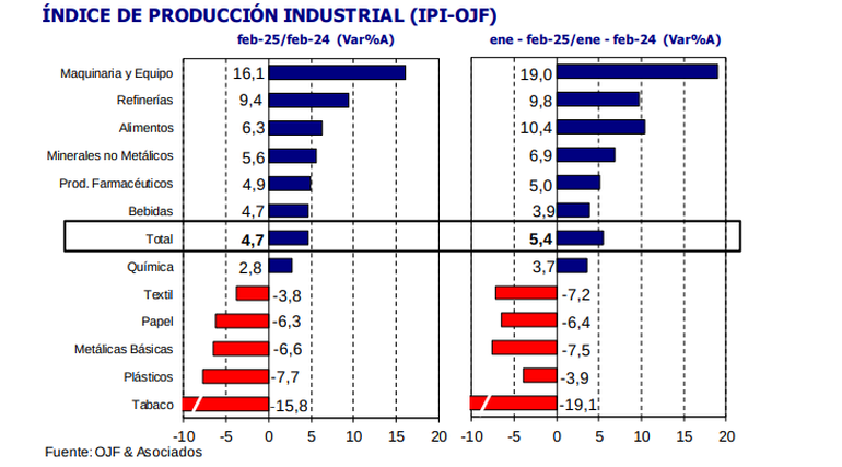 De acuerdo con el Indice de Producción Industrial de la consultora Orando Ferreres (IPI-OJF), en febrero la producción industrial creció 4,7% al comparar con igual mes del año pasado.