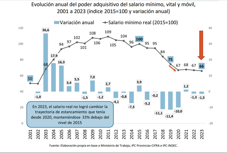El reporte sostiene que “el salario mínimo no escapa a estas tendencias, lo que empeora el bajo valor real que venía teniendo en los últimos años” ya que “durante el gobierno de Mauricio Macri perdió un 25% de su poder adquisitivo, y a ello se sumó una caída adicional del 10% durante el año de mayor impacto de la pandemia”.