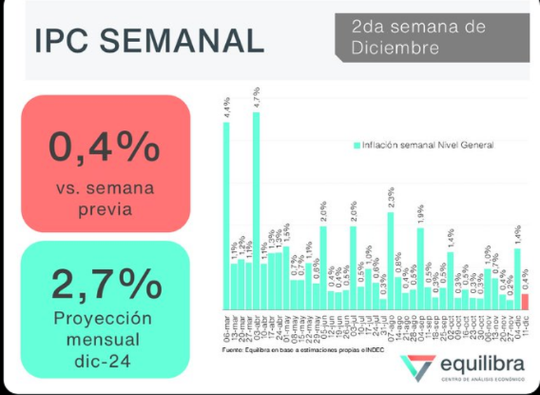 En la segunda semana de diciembre los precios subieron 0,4% respecto de la semana anterior, informó la consultora Equilibra. De esa manera el promedio de las últimas 4 semanas ascendió al 2,5%, lo que permite estimar una inflación para todo el mes del 2,7%.