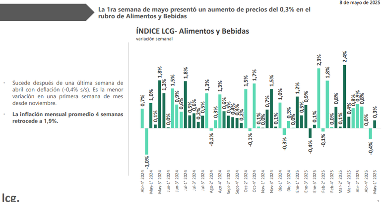 Las perspectivas de una mayor desaceleración en los días venideros se sustentan en la evolución semanal de la inflación de alimentos. En ese sentido, tanto en el 1,9% mensual promedio como el 0,7% punta a punta está la incidencia de los días previos a la caída de precios de la segunda semana de abril, al punto que si se tomase el promedio de las últimas tres semanas el resultado sería deflacionario.