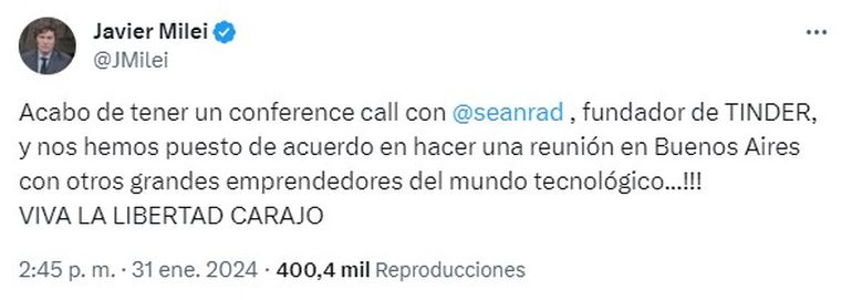 No, el título no es una broma. Es tan real como insólito. Y si bien roza las características de un verdadero papelón, el presidente consideró que era una gran idea anunciarlo en redes sociales. ¿De qué hablamos? De que, en pleno tratamiento de la Ley Ómnibus, Javier Milei se reunió con empresarios de Tinder.