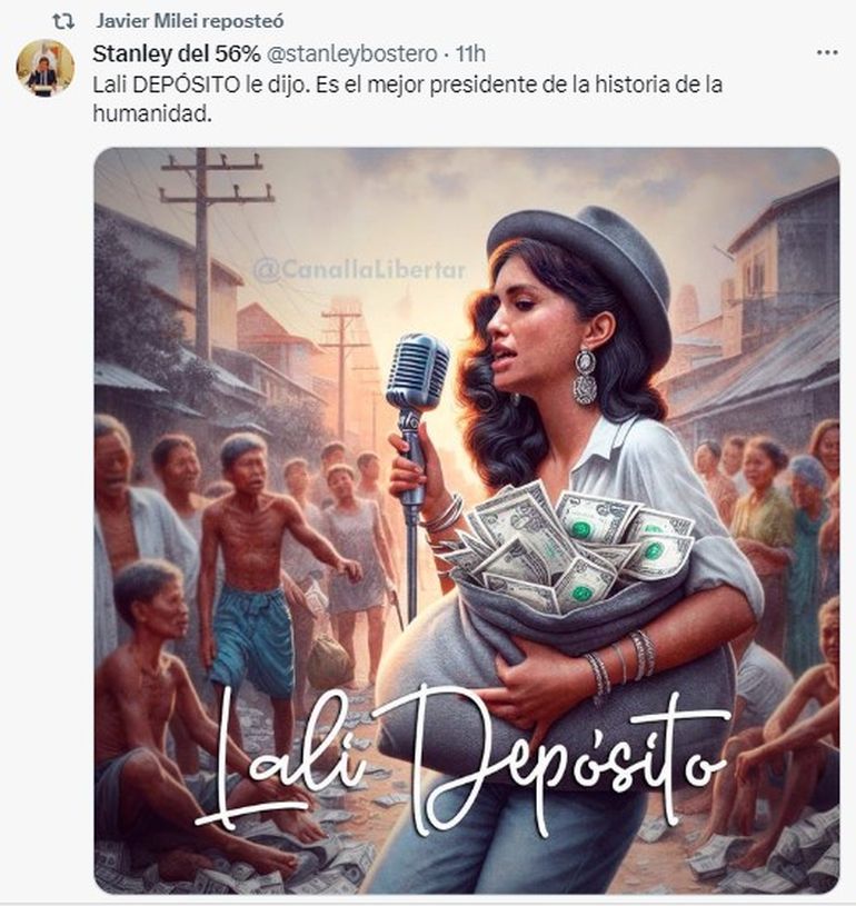 El capricho del Presidente con la artista suele generar contenido constante en redes sociales. Allí, Javier Milei comparte mensajes propios, aunque la mayoría del tiempo republica mensajes de otros usuarios atacando a Lali.