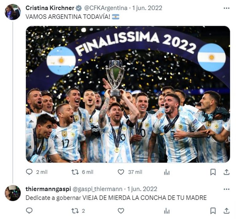 Rápidamente, el clip se viralizó en las redes sociales y bastaron unos minutos para que los usuarios encontraran el perfil de Gaspar en Twitter. Allí creció la polémica, porque se pueden ver varias publicaciones agresivas, en las que cruza a "los zurdos" o insulta a la vicepresidenta, Cristina Fernández de Kirchner.