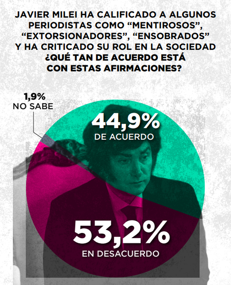 El estudio incorpora preguntas específicas sobre el vínculo entre Milei y el periodismo. Para el 56%, cada vez que el presidente ataca a quienes no piensan como él, lo hace para desviar la atención de la situación económica. A su vez, un 62,7% dice estar de acuerdo -total o parcialmente- con que esas críticas son un ataque a la libertad de prensa.