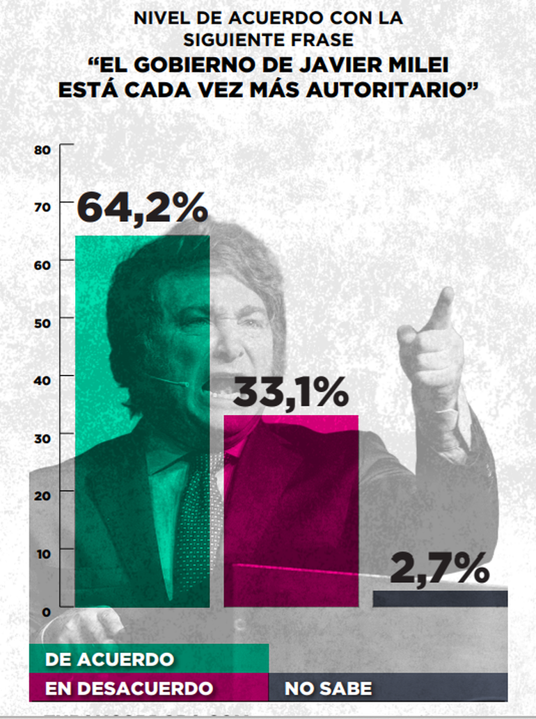 El dato más contundente del relevamiento es que el 67% de la ciudadanía considera grave que el presidente utilice insultos o lenguaje agresivo contra periodistas y medios de comunicación. Además, un 63% cree que las críticas presidenciales al periodismo constituyen un ataque a la libertad de prensa, y el 64% sostiene que el Gobierno es cada vez más autoritario.