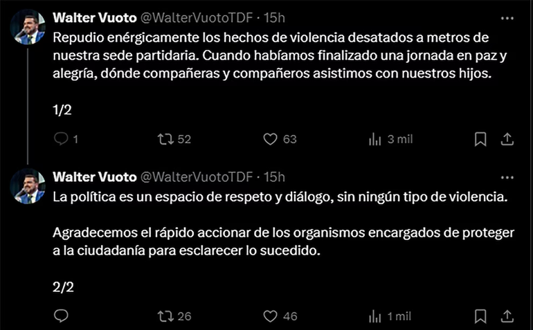 En su cuenta personal en X, Walter Vuoto se expresó en contra de lo sucedido. "Repudio enérgicamente los hechos de violencia desatados a metros de nuestra sede partidaria. Cuando habíamos finalizado una jornada en paz y alegría, dónde compañeras y compañeros asistimos con nuestros hijos", escribió el intendente de Ushuaia.