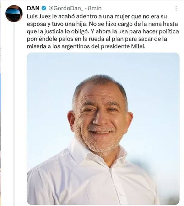 El "Gordo Dan", publicó este jueves un posteo ofensivo en el que atacó al senador del PRO, Luis Juez, y a su hija Milagros, quien padece parálisis cerebral. El mensaje, que fue borrado tras recibir un repudio generalizado, se produjo como reacción a la derrota que sufrió el Gobierno en el Senado con la ley de emergencia en Discapacidad.