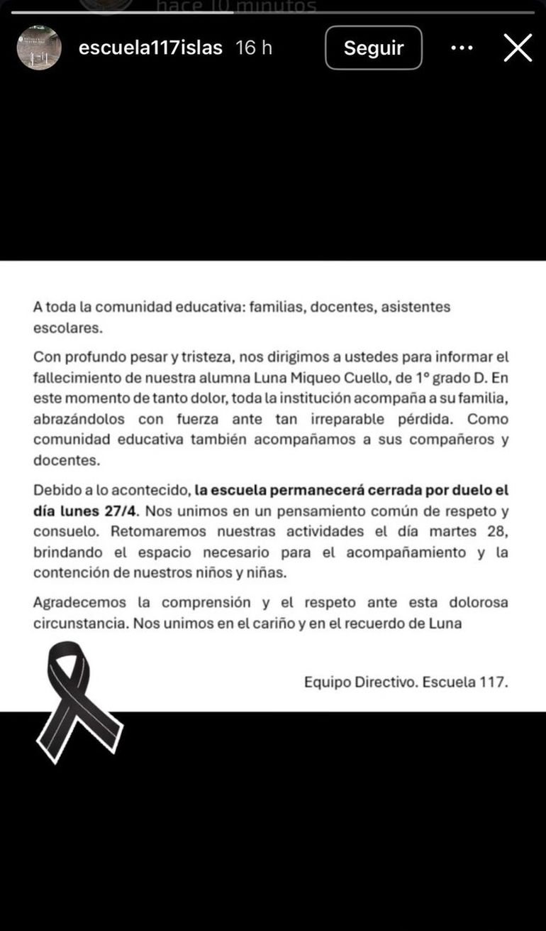 El establecimiento educativo emitió un comunicado en el que expresó su profundo pesar por la pérdida de la alumna. "Con profundo pesar y tristeza, nos dirigimos a ustedes para informar el fallecimiento de nuestra alumna Luna Miqueo Cuello, de 1° grado D. En este momento de dolor, toda la institución acompaña a su familia, abrazándolos con fuerza ante tan irreparable pérdida", indicaron.