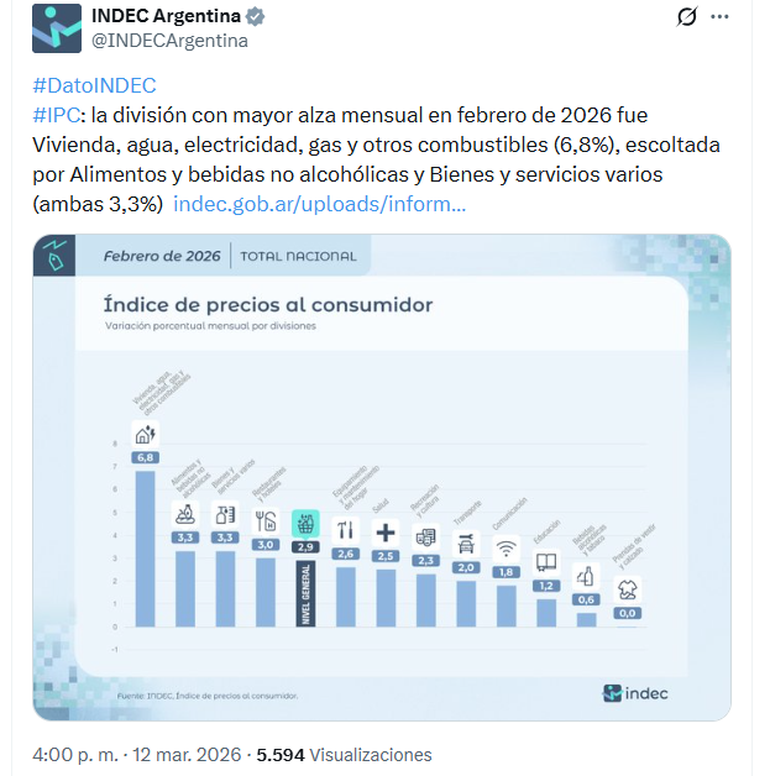 De acuerdo al informe del INDEC,"la división con mayor alza mensual en febrero de 2026 fue vivienda, agua, electricidad, gas y otros combustibles (6,8%), en tanto que en la segunda mayor división quedaron comprendidos: alimentos y bebidas no alcohólicas,y bienes y servicios varios (ambas 3,3%).