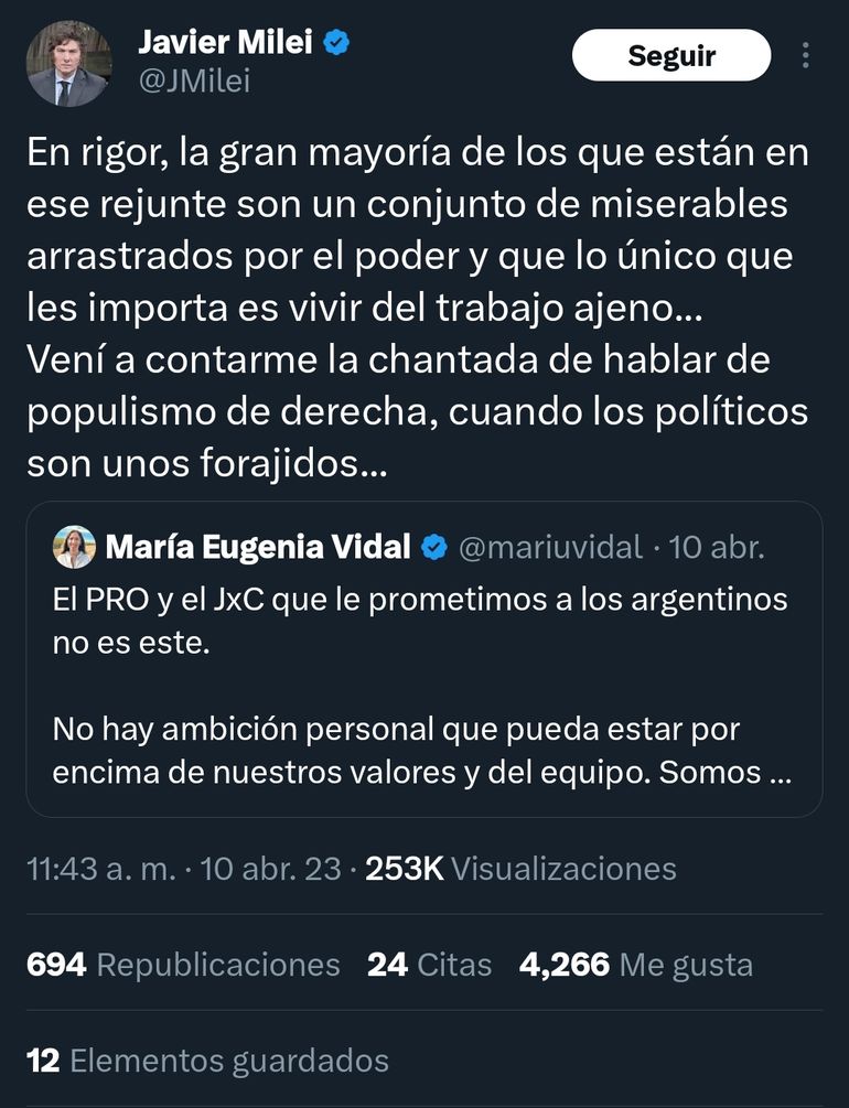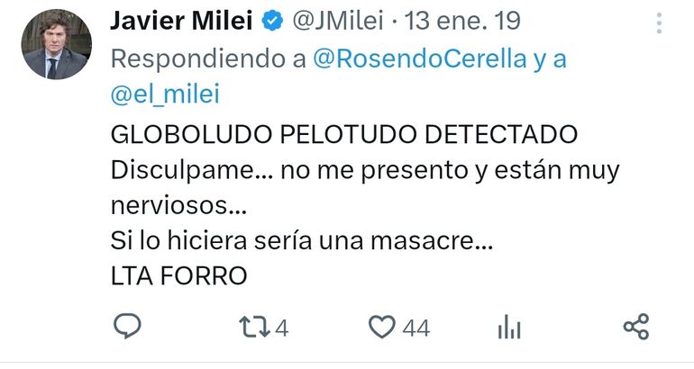 Hay sobrados ejemplos de declaraciones de Javier Milei cruzando a estos espacios. En las últimas horas, numerosos usuarios de Twitter se dedicaron a recopilar capturas de frases descalificadoras, algunas que incluso debió borrar el libertario por la cantidad de comentarios recibidos.