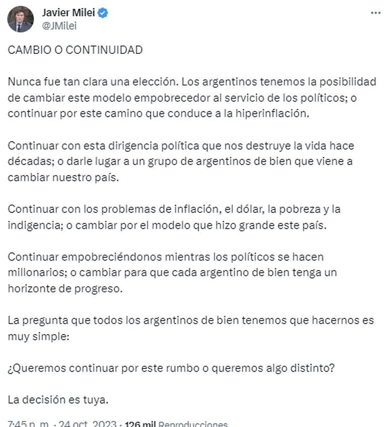 Minutos antes de las 20, utilizó sus redes sociales para fundamentar su participación en el balotaje. "Nunca fue tan clara una elección. Los argentinos tenemos la posibilidad de cambiar este modelo empobrecedor al servicio de los políticos; o continuar por este camino que conduce a la hiperinflación", aseguró.