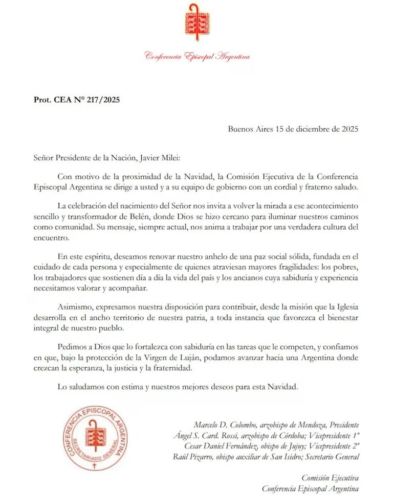 El pasado 15 de diciembre, la Conferencia Episcopal Argentina (CEA) envió su tradicional saludo navideño al presidente argentino. El texto adoptó un tono pastoral, anclado en el sentido religioso de la fecha, con referencias al nacimiento de Jesús y a la necesidad de fortalecer una cultura del encuentro en un contexto social complejo.