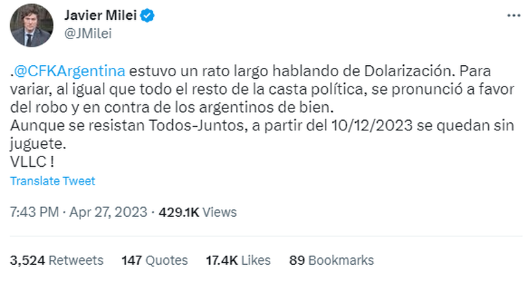 "Cristina Kirchner estuvo un rato largo hablando de dolarización. Para variar, al igual que todo el resto de la casta política, se pronunció a favor del robo y en contra de los argentinos de bien. Aunque se resistan Todos-Juntos, a partir del 10/12/2023 se quedan sin juguete", indicó a través de su cuenta de Twitter junto al hashtag #LaCastaTienenMiedo que llegó a ser tendencia en la red social.