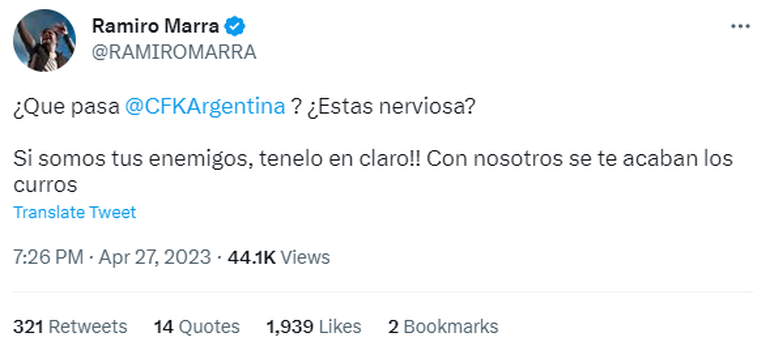 Junto a Milei, el legislador de la Ciudad de Buenos Aires Ramiro Marra también lanzó críticas contra la vicepresidenta al publicar en Twitter: "Si somos tus enemigos, tenelo en claro!! Con nosotros se te acaban los curros".