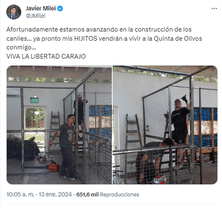 El presidente Javier Milei mostró en redes sociales cómo avanza en la Quinta de Olivos la construcción de los caniles para sus perros, a los que espera poder mudar pronto a la residencia.