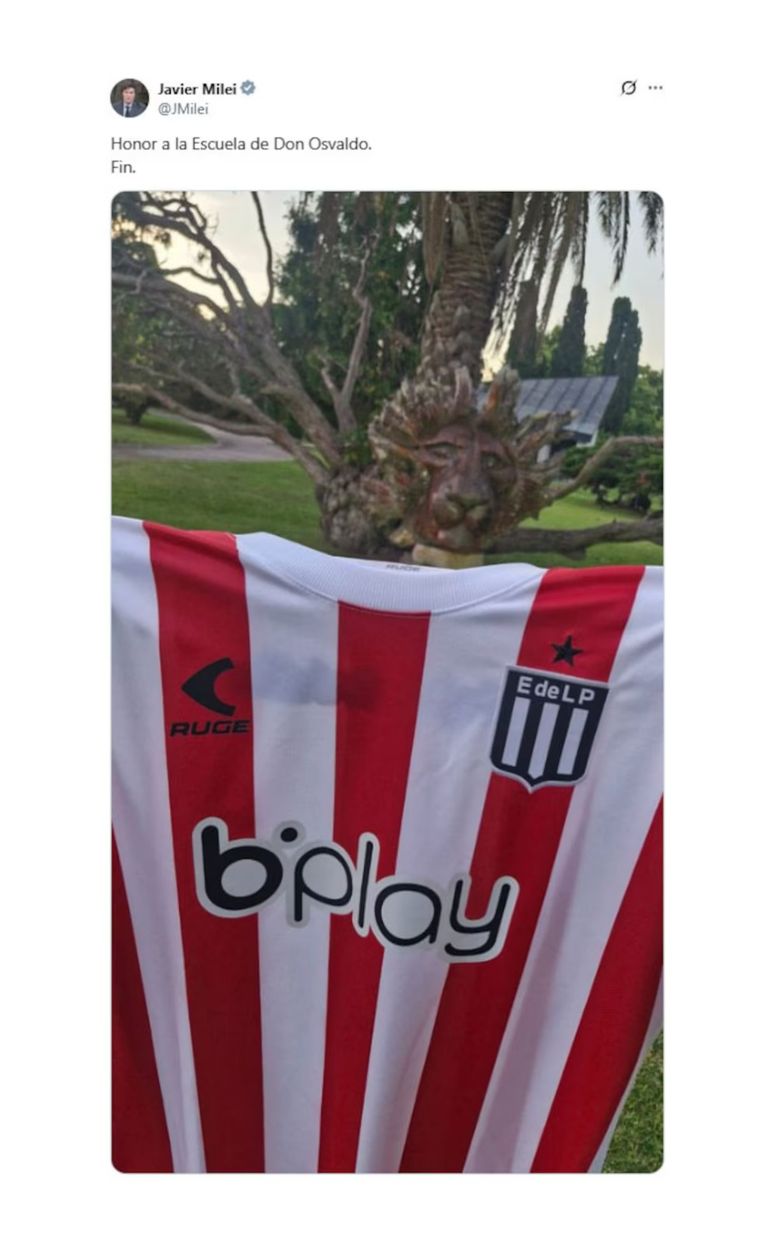 A esta polémica es que se sumó Milei, quien a través de su cuenta de X posteó una camiseta de albirroja con el mensaje: " Honor a la Escuela de Don Osvaldo". Con esta imagen, hizo referencia a Osvaldo Zubeldía, histórico entrenador que logró ganar tres veces la Copa Libertadores y la histórica Copa Intercontinental de 1968 ante el Manchester United.