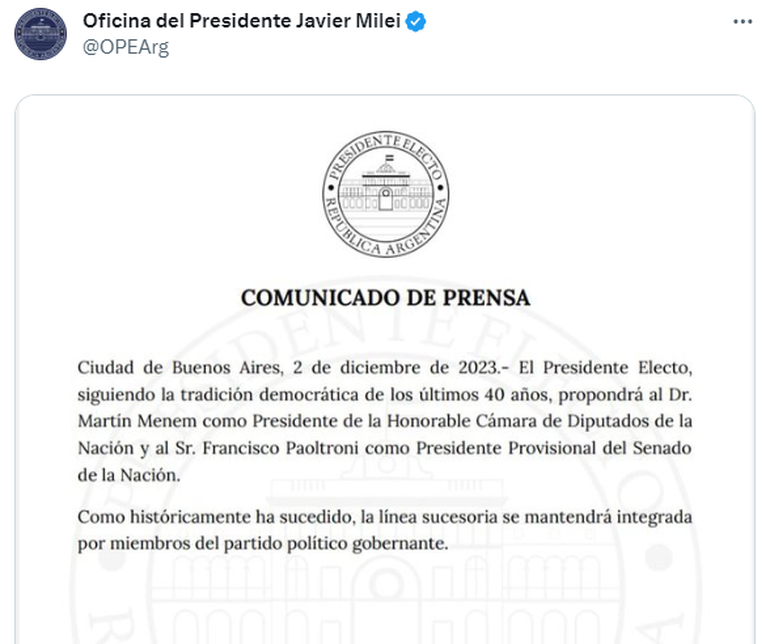 "El Presidente electo propondrá al doctor Martín Menem como presidente de la Honorable Cámara de Diputados de la Nación y al señor Francisco Paoltroni como presidente provisional del Senado de la Nación", indicó.