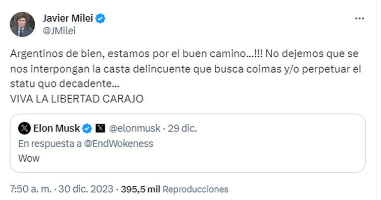 "Argentinos de bien, estamos por el buen camino...!!! No dejemos que se nos interpongan la casta delincuente que busca coimas y/o perpetuar el statu quo decadente... Viva la libertad carajo"; posteó en horas de la mañana el mandatario desde su cuenta en la plataforma X.