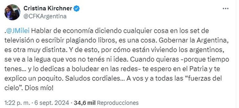 Alrededor de las 13:22, Cristina recogió el guante y le contestó al presidente. "Hablar de economía diciendo cualquier cosa en los set de televisión o escribir plagiando libros, es una cosa. Gobernar la Argentina, es otra muy distinta. Y de esto, por cómo están viviendo los argentinos, se ve a la legua que vos no tenés ni idea. Cuando quieras -porque tiempo tenes… y lo dedicas a boludear en las redes- te espero en el Patria y te explico un poquito. Saludos cordiales… A vos y a todas las “fuerzas del cielo”. Dios mío!", cerró CFK.