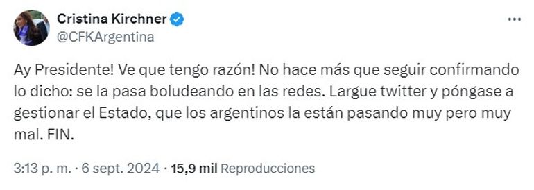 Casi como buscando tener la última palabra, CFK se despachó con otro posteo. "Ay Presidente! Ve que tengo razón! No hace más que seguir confirmando lo dicho: se la pasa boludeando en las redes. Largue twitter y póngase a gestionar el Estado, que los argentinos la están pasando muy pero muy mal. FIN".