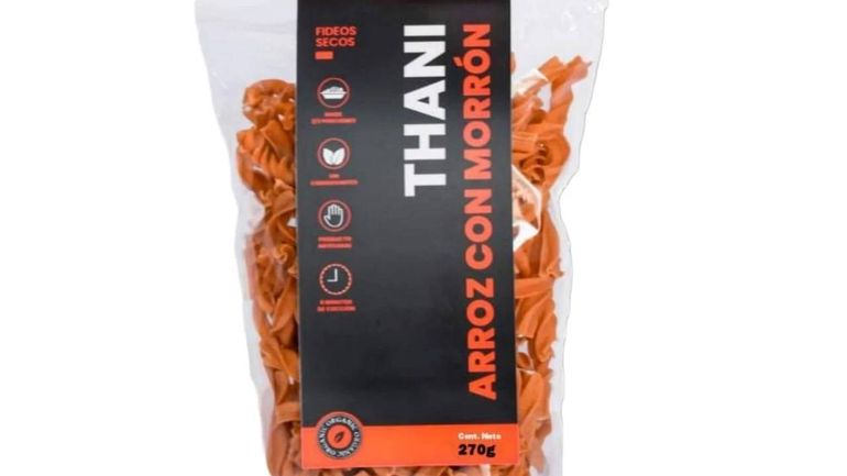 El producto en esta ocasión es "fideos secos de harina de arroz con morrón, marcha THANI, libre de gluten", contenido neto: 400 gramos, RNPA: 21-128984, Lote: 209, fecha de elaboración: 04/06/24, fecha de vencimiento: 04/06/25, elaborado por NyG SRL (RNE N° 21-115366).