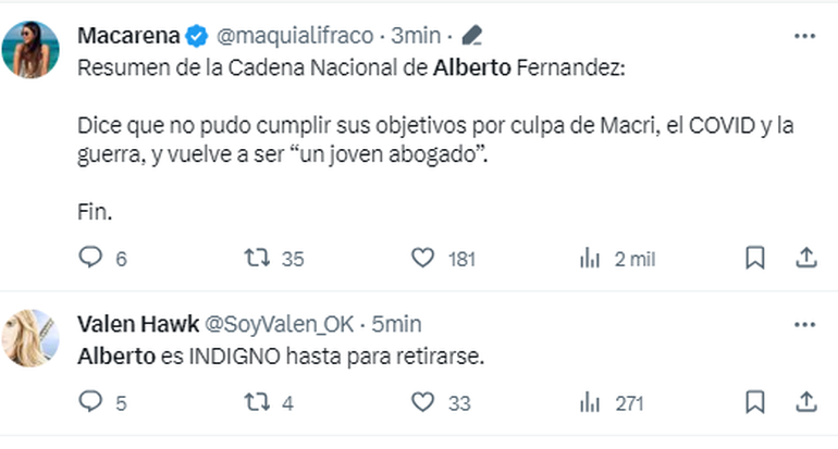 En las redes sociales hubo repercusiones y reacciones casi en simultáneo con el discurso. Los memes llovieron, principalmente, en la red social X (Twitter).