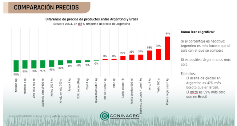 Así lo indica un estudio hecho por Coninagro en tres supermercados de primera línea en ambos países. Las diferencias de precios más significativas.
