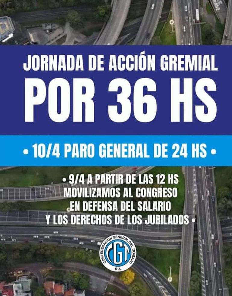 La Confederación General del Trabajo (CGT) ratificó que el paro general previsto para el 10 de abril será de 36 horas. La medida de fuerza empezará el miércoles 9 en horas del mediodía y el 1° de abril, confirmaron que la extenderán para sumarse a la marcha de jubilados.