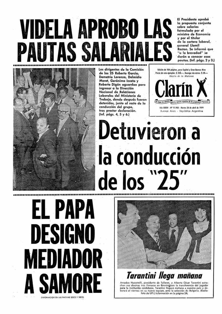 En la tarde del 23 de abril veinte gremialistas pertenecientes a la “Comisión de los 25”, fueron detenidos por la Policía Federal, al abandonar la Dirección Nacional de Relaciones Laborales del Ministerio de Trabajo, en Moreno 769, donde habían sido citados para ratificar o rectificar esa decisión. Fueron detenidos en el hall del edificio: Roberto García de taxistas; Carlos Cabrera de mineros; Enrique Mico del vestido; Jorge Luján de obreros del vidrio; Gerónimo Izetta de municipales; Fernando Donaires y Demetrio Lorenzo de alimentación; Natividad Serpa de obras sanitarias; José Rodríguez de SMATA; Raúl Crespi del SUPE; Saúl Ubaldini de cerveceros; Roberto Digon de tabaco; Delmidio Moret de la Federación de Luz y Fuerza; Víctor Marchese del calzado; Rodolfo Soberano de molineros; Raúl Ravitti de ferroviarios; Ramón Gaetani de aceiteros y Alberto Campos de la UOM. Asimismo fueron detenidos varios gremialistas que se encontraban en un bar en la esquina de Moreno y Piedras aguardando que finalizará la reunión entre ellos el titular de la Federación de Camioneros Francisco Racicky y el dirigente aceitero Felipe Mascali.