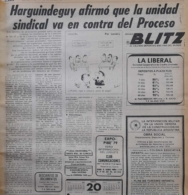 El 20 de abril Clarin recoge declaraciones del entonces Ministro del Interior Albano Harguindeguy : “consultado sobre si los intentos de unidad que realizan los dos grandes grupos gremiales no significan un problema para el Proceso, el ministro respondió : “Yo creo que sí, porque el tipo de reunificación que pretenden realizar, no está de acuerdo con el reordenamiento gremial que ha fijado el gobierno de la Nación, donde las pautas de la Junta Militar han determinado la existencia de organizaciones sindicales hasta el segundo grado. Este tipo de reunificación, está pretendiendo nuevamente, tener un organismo máximo, con una dirección sindical única, que casi siempre, estuvo fuera de lo que es su función específica, es decir que más allá de la función sindical, se incursionó en el campo político. Esto va en contra de los de lo que son los principios liminares de este Proceso” afirmó.