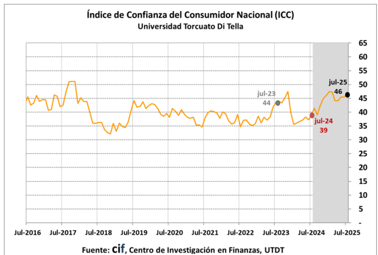 “El Índice de Confianza del Consumidor (ICC) de julio se situó en 46,37 puntos, lo que representa un incremento del 1,97% respecto a junio”, señaló la UTDT.