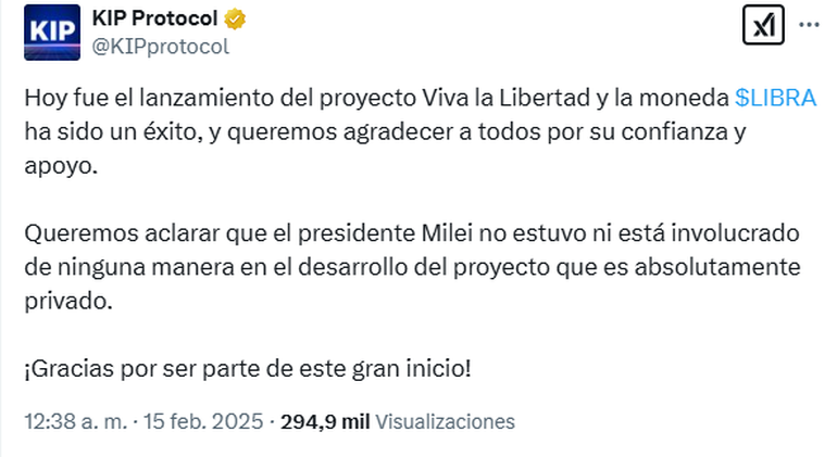 "Hoy fue el lanzamiento del proyecto Viva la Libertad y la moneda $LIBRA ha sido un éxito, y queremos agradecer a todos por su confianza y apoyo", tuitearon desde la cuenta oficial.