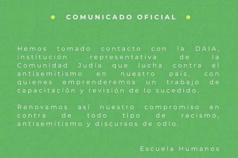 A raíz de este episodio la escuela realizó un comunicado en el que se condenó el accionar de los jóvenes. "Escuela Humanos repudia enérgicamente el accionar de un grupo de alumnos durante su viaje de egresados. De igual manera, repudiamos la actitud de la empresa organizadora y del coordinador a cargo, aclarando que nuestra institución no tiene vínculo alguno con sus prácticas ni mensajes", indicó el colegio ubicado en Canning, zona sur del conurbano bonaerense.