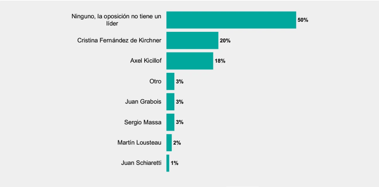Con respecto al liderazgo opositor, sigue primera la ex presidente Cristina Fernández de Kirchner, como la principal líder de la oposición con un 20%. Pero el verdadero primer lugar se lo lleva el casillero Ninguno. Para el 50% de los entrevistados, la oposición está acéfala.