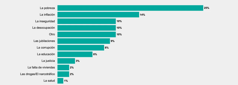 La pobreza es la principal preocupación de los entrevistados, desplazando a la inflación por cuarto mes consecutivo. De todos modos la inflación no se retira del todo, conservando un segundo lugar. El podio de las preocupaciones lo completa, como viene siendo costumbre de un tiempo a esta parte, la inseguridad.